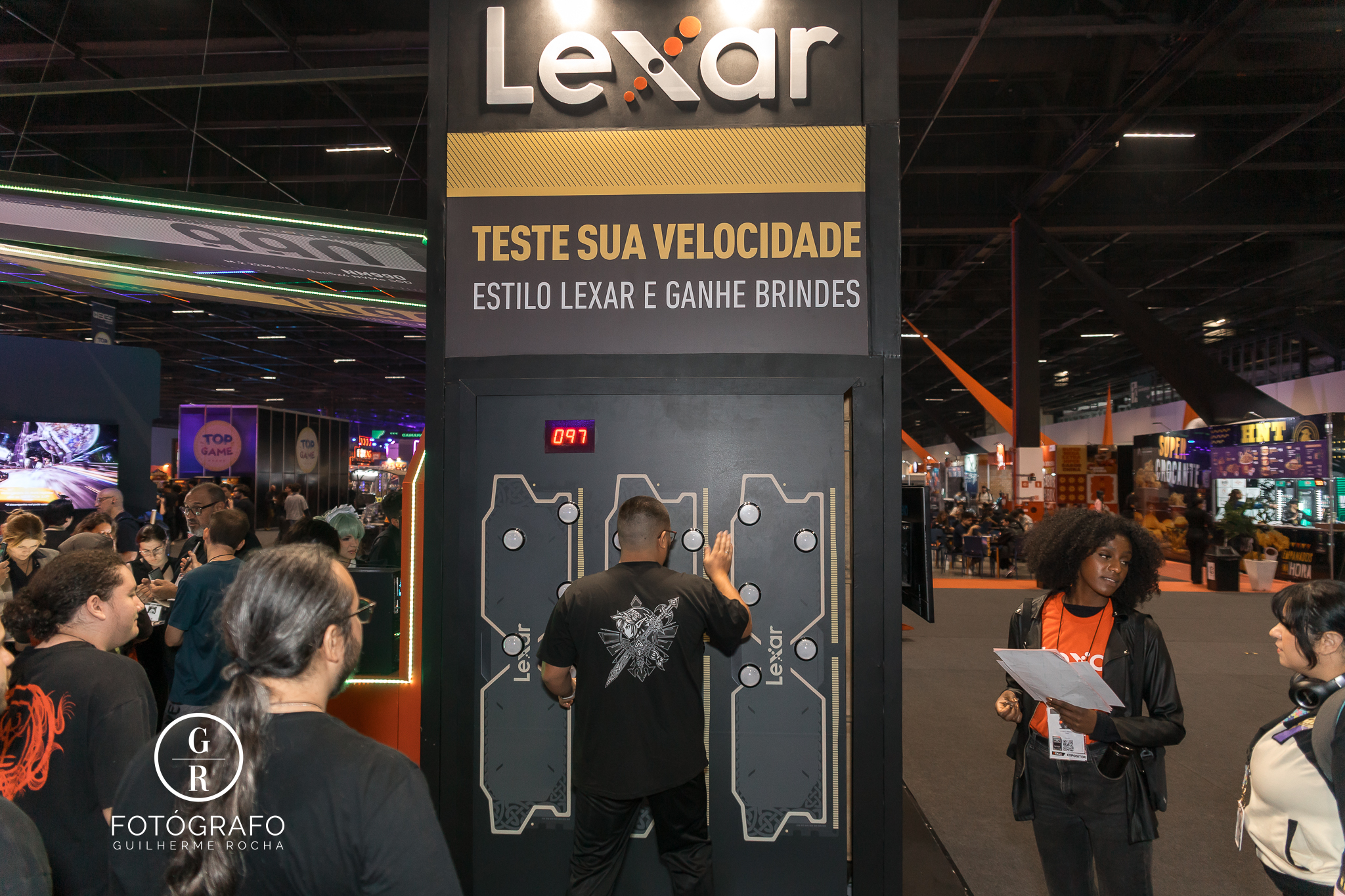 O estande da Lexar chama atenção desde o primeiro dia de evento pelo visual inspirado em um cartão SD gigante e pelas luzes vibrantes que criam um ambiente moderno e tecnológico. O espaço conta com cinco ativações principais: