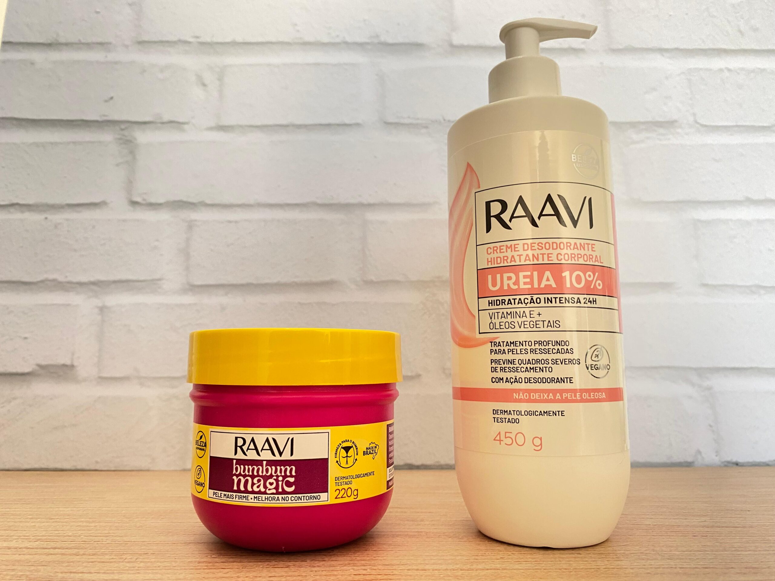 A Raavi aposta em texturas ricas e resultados rápidos. O destaque vai para o Creme Bumbum Magic, que oferece firmeza e maciez com uso contínuo. A aplicação é simples e o toque é aveludado, sem deixar a pele pegajosa. O perfume é suave e lembra produtos de spa, tornando o momento de cuidado mais prazeroso.